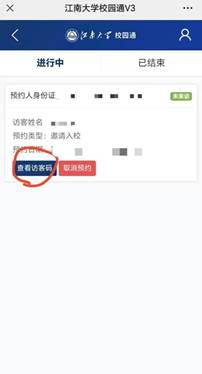 手机关注“e江南”微信公众号,点击屏幕下方“校园服务”中的“访客预约”,进入后点击“我的预约”,点击“查看访客码”即可获得访客码。进入校园时出示访客码。