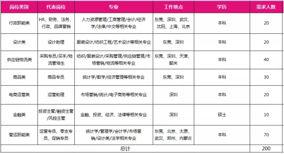 行政职能类、服装设计类、供应链类、物流类、商品类、电商运营类、金融类(硕士)、营运职能类等。