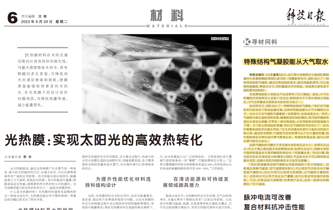 潜心科研,结得硕果累累。余治华对纤维素气凝胶设计了一种核壳润湿性梯度结构,从根源上解决了吸湿盐泄漏的问题。他从实际出发,推动了大气集水材料的创新发展和安全问题的有效解决。期间,他的最新成果发表在Cell的子刊Matter上,该项成果被《科技日报》《科学网》等主流媒体重点报道,若继续进行工业化探索,有望缓解西北地区干旱缺水的问题。