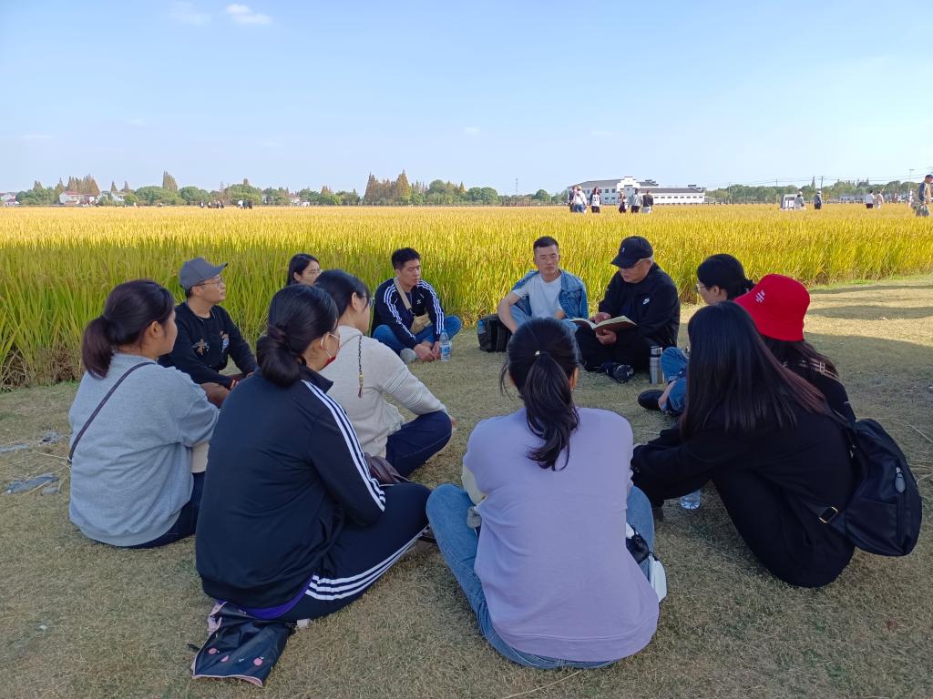 活动期间,学院关工委常务副主任、特邀党建组织员袁伯兴在严家桥村示范稻田区,给支部党员上了一堂接地气、冒热气、聚人气的专题党课。袁老师的党课紧紧围绕党的二十大报告原文,他要求党员同学在进行学习时要坚持读原文、悟原理,原原本本、原汁原味学习党的二十大报告。袁老师从中国革命历史发展进程的脉络出发,号召党员同学要深刻认识“两个确立”的决定性意义,始终牢记“四个始终”,紧密团结在以习近平同志为核心的党中央周围,增强“四个意识”、坚定“四个自信”、做到“两个维护”,坚定不移在思想上政治上行动上同以习近平同志为核心的党中央保持高度一致。针对博士生党员群体实际,在谈到同学们未来人生规划与发展时,袁老师希望同学们要自觉将“小我”成长融入“大我”奋斗,将人生选择与中华民族伟大复兴中国梦结合起来。袁老师希望同学们要学习感悟严家桥唐氏家族实业报国的深厚情怀,勉励大家要以老一辈爱国志士为榜样,大力弘扬工匠精神,攀登奋进,自觉从党的重大成就和历史经验中增长智慧,增强信心,在纺织强国的新征程上聚力同行。