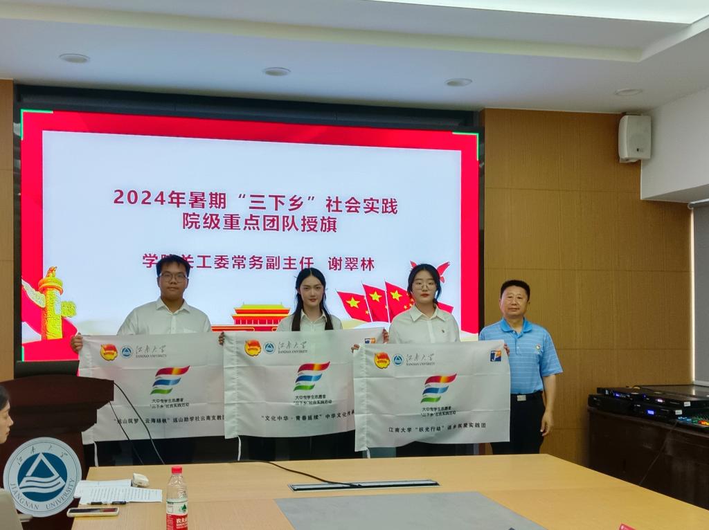 活动中,陈裕进行工作部署,介绍学院2024年暑期社会实践组织情况;伏曦宣读院级重点团队名单,今年学院共组建9支院级重点团队,其中3支入选校级重点团队,1支推荐为省级重点团队;谢翠林向院级重点团队授旗;“鼋梦丝路”纺织援疆团负责人陈顺和“织光行动”返乡筑爱实践团负责人李铭宇代表重点团队发言,他们表示将以青春的热忱和专业的知识投身实践,在基层一线的广阔舞台上开启实践成长之旅。